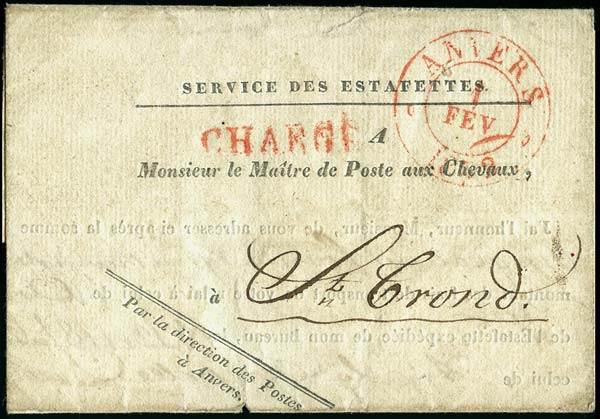 1832- Formulaire imprimé du Service des Estafettes envoyé le 1er février d'Anvers à St Trond en "Chargé" (griffe rouge française) avec espèces couvrant le découvert de 3 estafettes pour Aix-La-Chapelle. Grande rareté. Exceptionnel. |