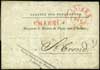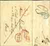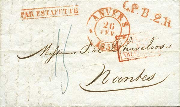 1834- Lettre du 26 fév. d'Anvers à Nantes, griffe "Par Estafette", "LPB 2R" et taxé à l'encre bleue (de Paris) à "15" déc. (convention du 1er oct. 1818). Très rare et superbe. |