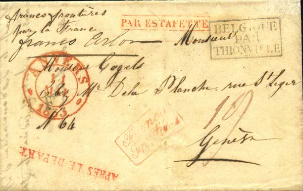 1833- Lettre du 14 mai d'Anvers à Genève via Arlon- Thionville avec griffe "Par Estafette" en man. "Franco Frontières par la France" et "Franco Arlon" (man. + griffe) avec explicatifs des différents ports. Une des quelques lettres connues pour Genève par estafette. Rare et superbe. |