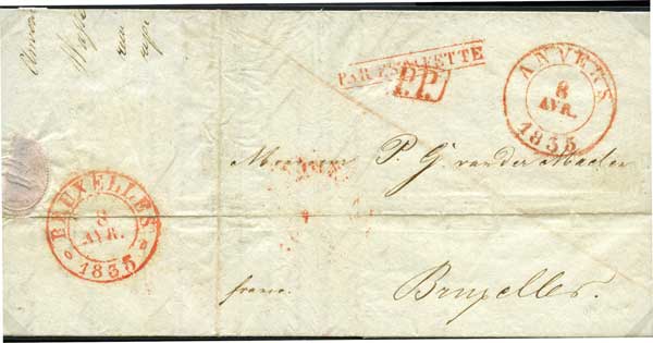 1835- Lettre du 8 avril d'Anvers à Bruxelles, griffe "Par Estafette" et "PP". Rare et TB. |