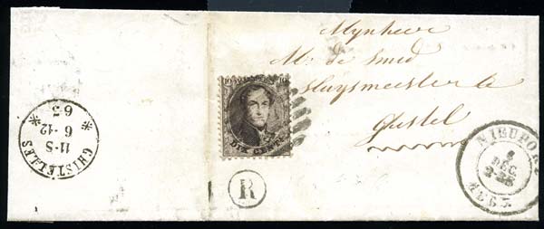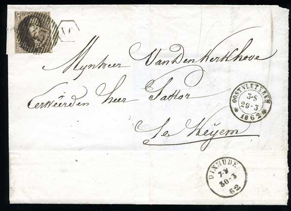 N°14 -10 c. brun-, obl. P87, 8 barres de Nieuport sur une lettre du 6 déc. 1863 de Schore (boîte R) à destination de Ghistelles. Superbe. |