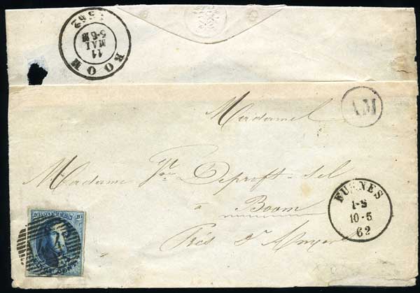 N°11 -20 c. bleu-, belles marges, obl. P44 de Furnes sur une lettre du 10-5-62 de Adinkerke (boîte AM) à Boom. Superbe. |