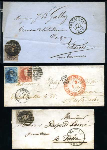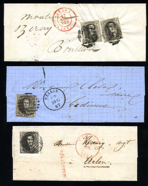 N°6 sur une lettre de Virton à Arlon avec "Après le départ", n°6 (2) sur un pli d'Arlon à Bouillon et n°10 sur un pli de Wellin (P191) à Gedinne. TB lot. |
