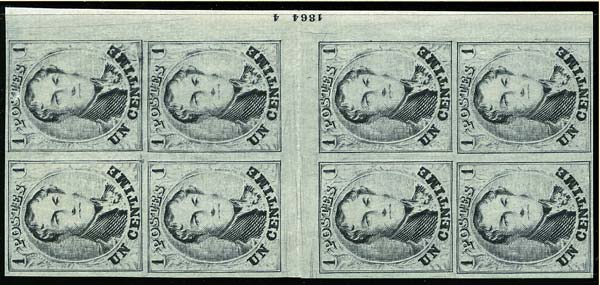 Réimpression de 1929 du 1 c. en noir en bloc de 8 interpanneau avec b.d.f. portant le millésime 1864. Superbe. |