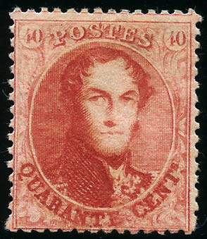 N°20 -40 c. rose carmin-, dent. 14 1/2 x 14, neuf sans charnière et très bien centré. Rare et superbe. COB. 1250+++. |