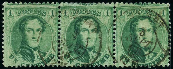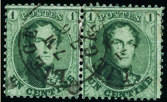 N°13 -1 c. vert-, dent. 12 1/2 en paire, obl. centrale de Liège. Rare. |