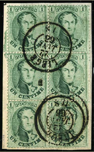 N°13B -1 c. vert-jaune-, en bloc de 6 sur fragment avec double obl. centrale "Liège 22 janv. 66". Ex-Collection Scheerlinck. Signé Williame et Corneille. Rare et superbe. |