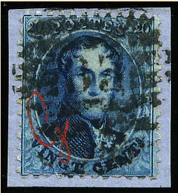 N°15 -20 c. bleu-, obl., surchargé guillochin. Superbe. |