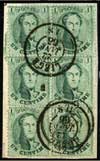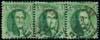 N°13A -1 c. vert- dentelure 12 1/2 x 13 1/2, en bande de 3, proprement obl. Superbe nuance. |