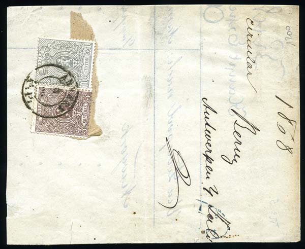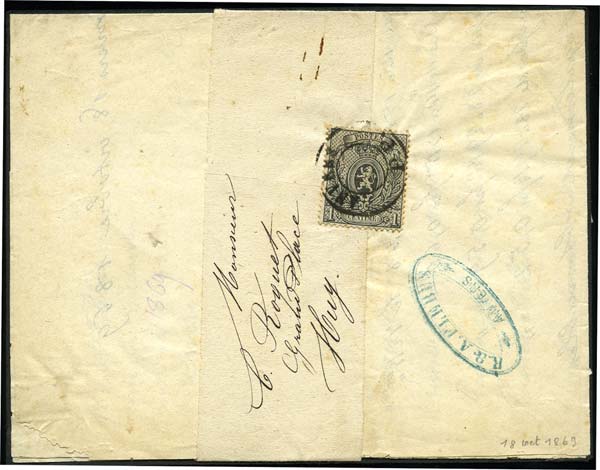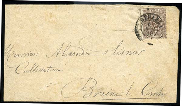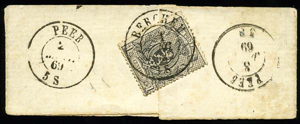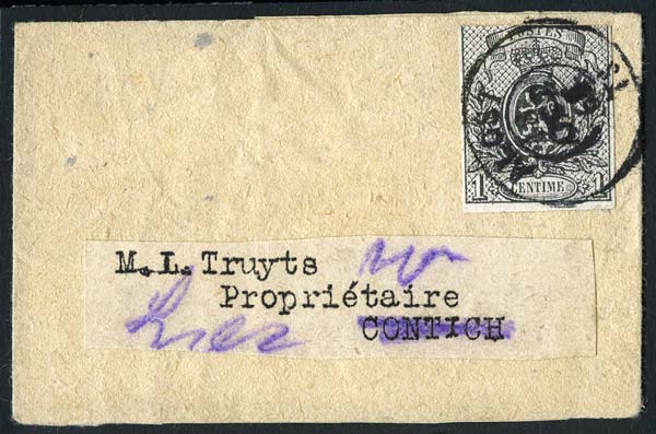 N°23 -1 c. gris- au verso d'une bande d'imprimé, envoyée de Berchem (obl. double cercle du 1er déc. 69) à destination de Peer (sur le recto obl. à pts 36 de Berchem). Rare et superbe. |