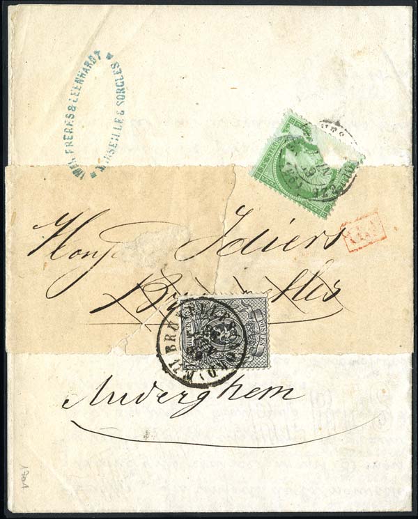 Imprimé sous bande de Sorgues (France) affranchi avec 5 c.vert dentelé (Napoléon III), déchiré à l'ouverture, à destination de Bruxelles et réexpédié à Auderghem avec n°23 de Belgique, obl. Bruxelles Nord 26 juin 69 avec "PD" en rouge. Rare. |
