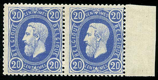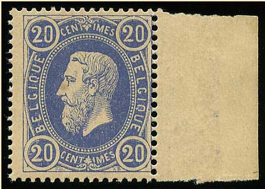 N°31 -20 c. bleu-, neuf sans charnière, bord de feuille droit. Certificat Soeteman. COB. 375 euros. |