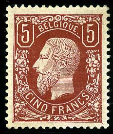 N°37 -5 fr. brun-rouge-, petite bulle de gomme percée sinon TB qualité. TB centrage et belle nuance. Certificat Soeteman. |