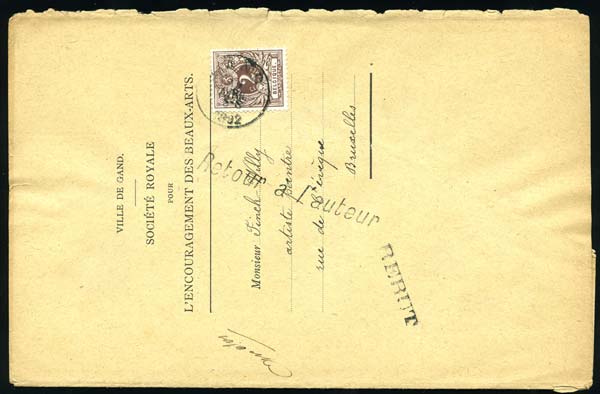 N°44 -2 c. brun- sur une enveloppe imprimée de Gand du 12-4-1892 à destination de Bruxelles avec griffes "Rebut" et "Retour à l'envoyeur". Superbe. |