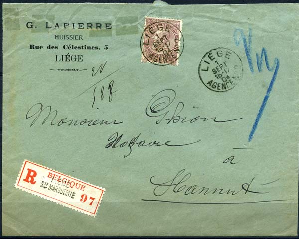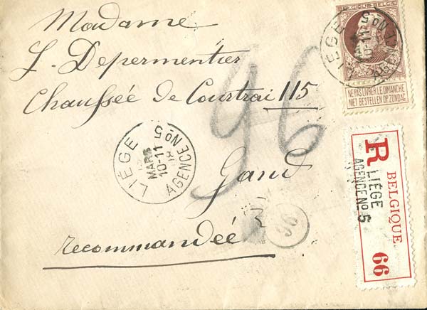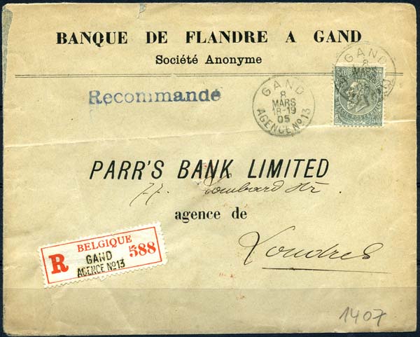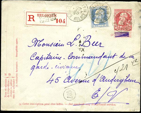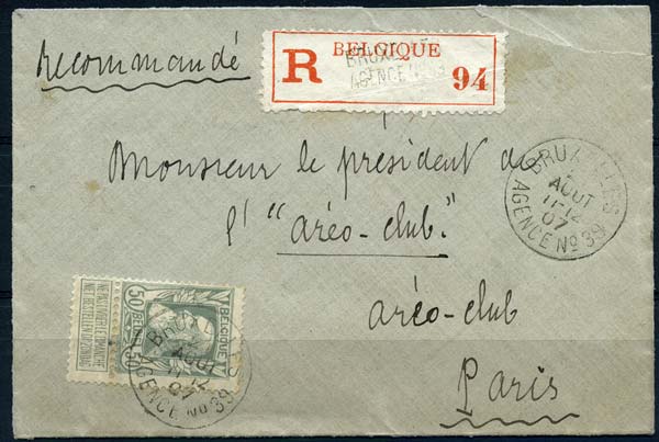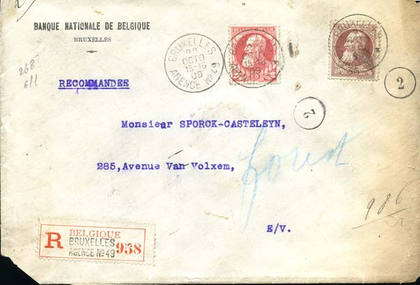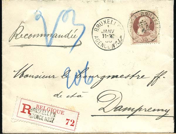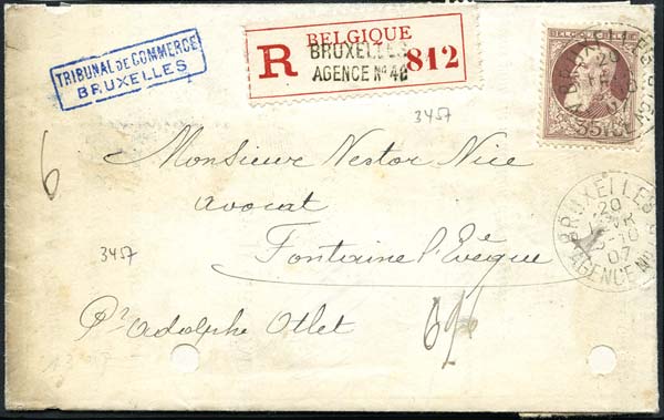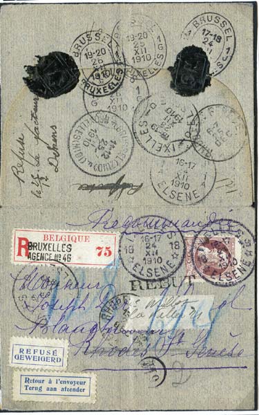 N°77 -35 c. brun-, obl. agence Ixelles 18 sur une lettre rec. du 24/12/1910 (avec sur l'étiquette rec. la griffe de sa dénomination d'avant le 19 oct. 1910: "Bruxelles Agence 46") à destination de Rhodes-St-Genèse + griffe "Rebut", étiquettes "Refusé", "Retour à l'envoyeur". Exceptionnel. |
