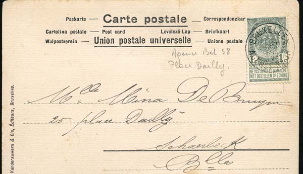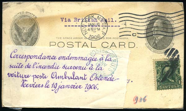1906- Carte datée de New-York du 8 janv. avec étiquette "Correspondance endommagée à la suite de l'incendie survenu à la voiture-poste Ambulant Ostende-Verviers le 19 janvier 1906". Cachet "Postes Rebuts Belgique 21 janv. 1906". Grande rareté et TB. |