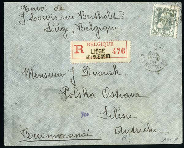 N°78 -50 c. gris- sur lettre rec. vers l'Autriche, obl. agence n°10 du 8 avril 1909. TB. |