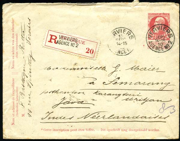 Enveloppe n°14 de 10 c. avec n°77 et n°82 (10) au verso, pour un affr. rec. de 65 c. à destination des Indes Néerlandaises et obl. agence n°2 du 13 sept. 1910. Très rare et TB. |