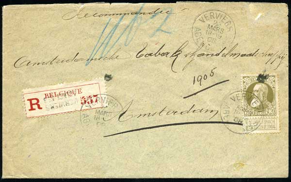 N°75 -20 c.- seul sur enveloppe rec. (manque un timbre au verso), envoyé à Amsterdam et obl. agence n°3 du 26 mars 1908. |