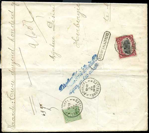 N°137 et 144, obl. "Bxl 3/12/19" sur un devant de grande enveloppe (69 gr.) en franchise partielle avec valeur de 2100 frs en assuré (griffe bilingue) de Bruxelles à Meulebeke. TB. |