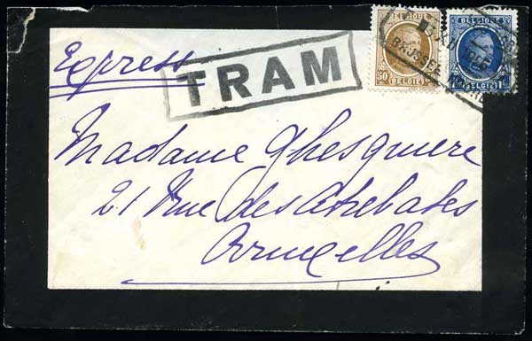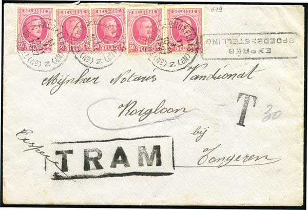 N°200 (5) pour un affranchissement de 1,50 fr. sur une lettre exprès avec griffe bilingue + "TRAM" (65 x 20), envoyée le 11 janv. 1927 de Bruxelles à Tongres, taxée à "30" avec griffe "T" pour le transport par tram. Rare et superbe. |