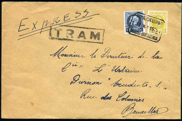 N°205 et 211 sur une lettre par exprès, obl. rect. bilingue "BXL Quartier Léopold 17/X/1929" envoyée à Bruxelles avec griffe encadrée "TRAM" (55 x 10). TB. |
