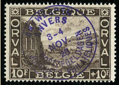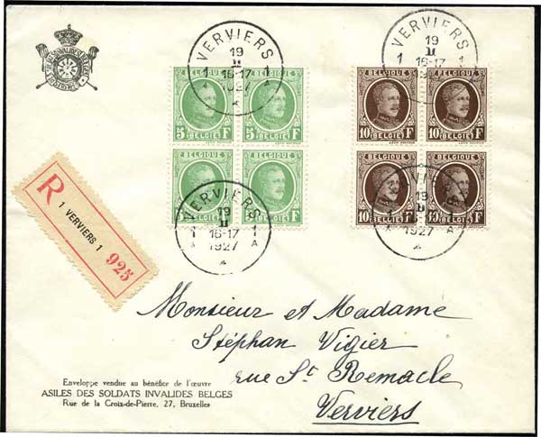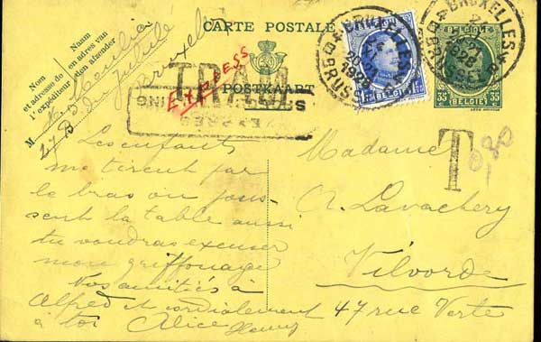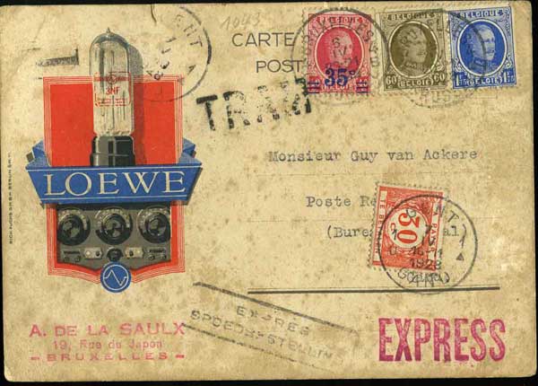 N°247, 255 et 257 sur une carte illustrée (légèrement souillée) avec griffe "TRAM" envoyée le 6/4/28 par exprès de Bruxelles à Gand (poste restante) avec TX35 de 30 c. à l'arrivée. Rare. |