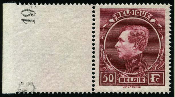 N°291E -50 fr. lie de vin carminé-, b.d.f. Superbe. Certificat. COB. 1150 euros. |
