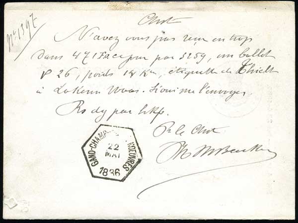 Carte correspondance de service avec réponse, obl. du cachet hexagonal "Gand-Champ-Des-Manoeuvres". Rare et superbe. |