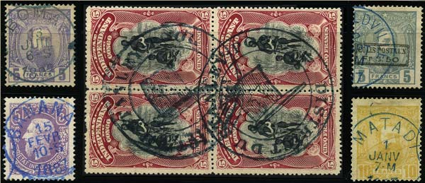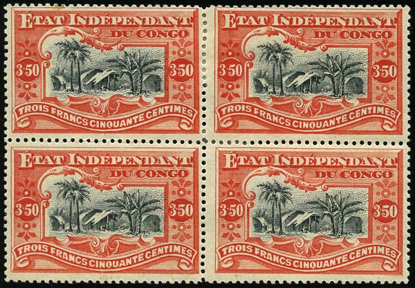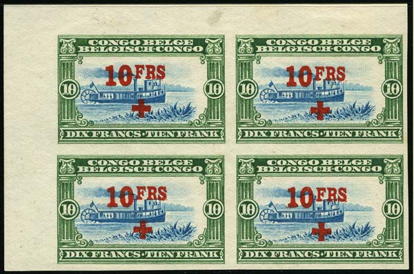 N°16, 18, 24 et 25, tous en blocs de 6, 6 timbres surchargés Congo-Belge, n°62 (110 euros), n°85A (180 euros) et n°87B (35 euros). Tous sans charnière, superbes. |