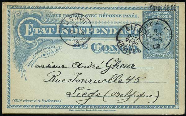 Carte postale avec réponse payée (L7) envoyée de Lukafu le 8 sept. 1909 à Liège (23 oct. 1909) par Musofi (16 sept.).Superbe. |